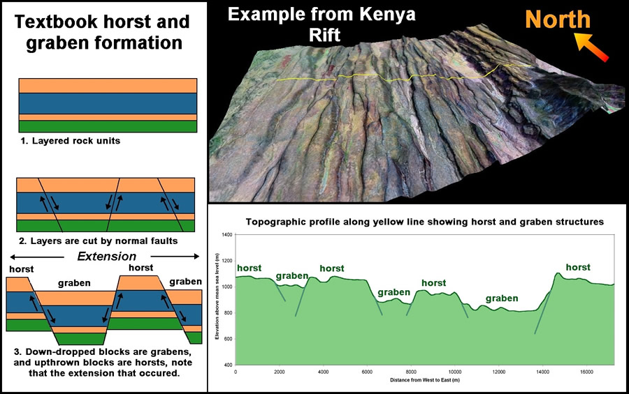 Ook in Kenia is er een afwisselende horst- en grabenstructuur te vinden, zoals te zien in onderstaande figuur:
